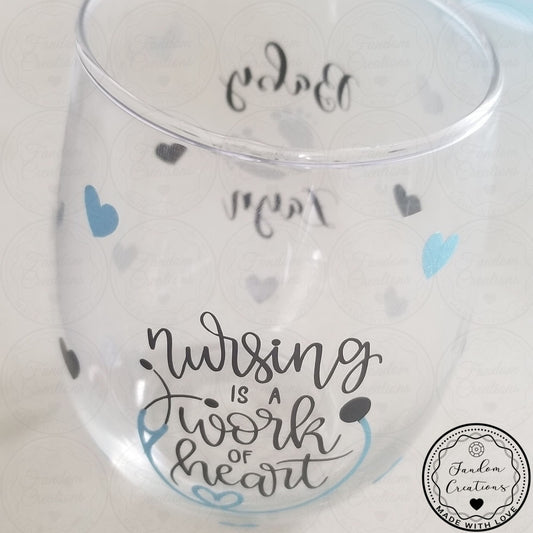 Nursing Is A Work Of Heart Custom Stemless Wine Glass Gift